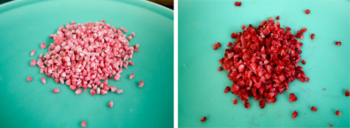 覆盆子融化前后。在融化之前不要嘗試吃它們,但要確保在它們結(jié)實(shí)的時候?qū)⑺鼈冨兩稀H诨氖谴嗳醯摹?/p>