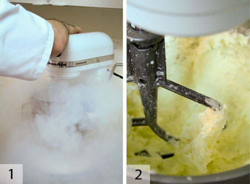 液氮冰淇淋的冰淇淋基料和液氮大約相等。1)您將看不到任何東西。2)成品。