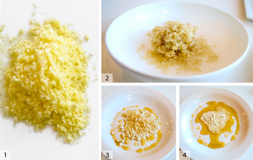 1)冷凍橄欖油。2)冷凍楓糖漿。3)冷凍蜂蜜。4)融化的冷凍蜂蜜。