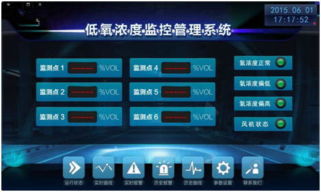 b) 軟件直接點(diǎn)擊低氧濃度監(jiān)控管路系統(tǒng);按鈕進(jìn)如;該界面 上可查看到系統(tǒng)運(yùn)行實(shí)際狀態(tài)并儲存、打印報警記錄。